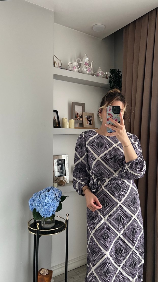 Gri bağlama desenli, uzun kollu ve tekne yaka, bol kesim uzun elbise. Transparan sentetik kumaştan yapılmış, bohem tarzını yansıtır. Günlük kullanım için uygundur.
