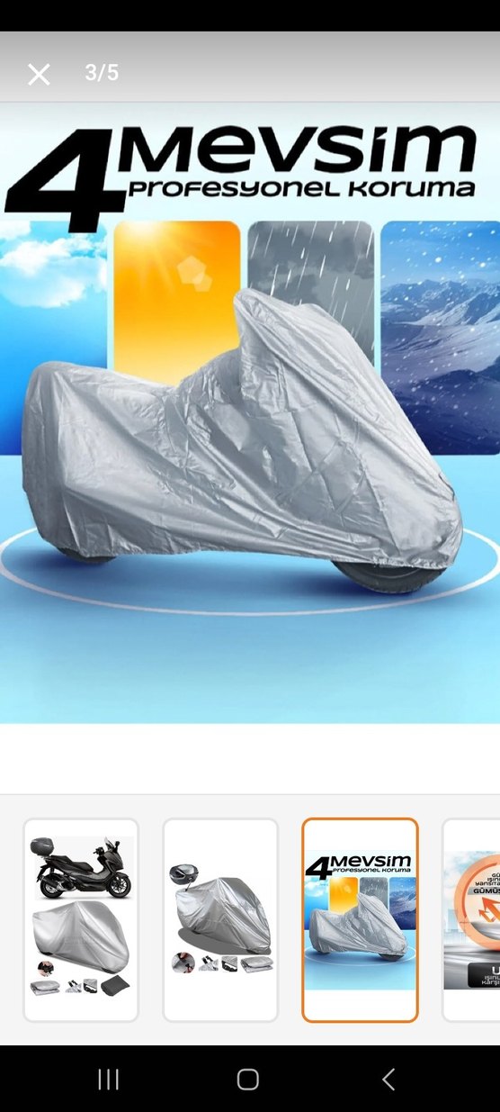 Gri renkte, desensiz motorsiklet örtüsü dört mevsim koruma sağlar. 'gMevsim' etiketi mevcuttur ve farklı boyutlara uyumludur. ️