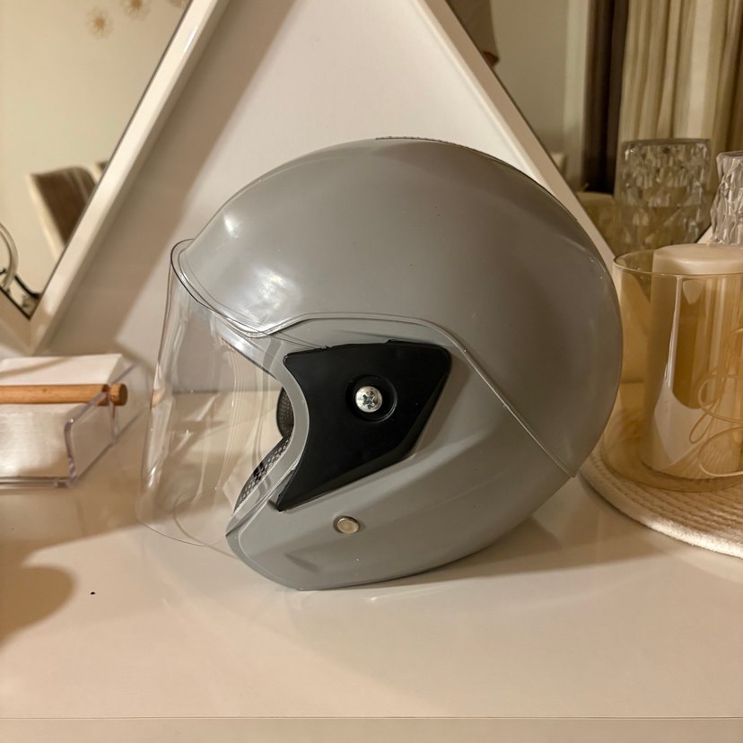Bu gri motosiklet kaskı, tokalı kayış ve şeffaf vizöre sahip sade, desensiz minimalist bir tasarıma sahiptir. ️