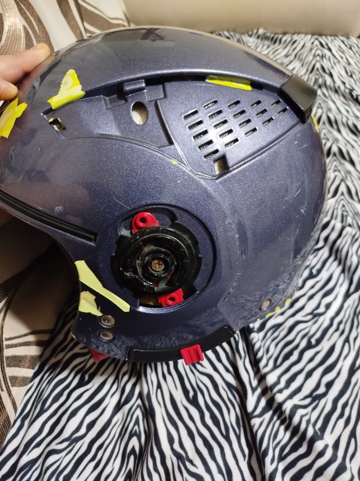 Gri plastik motosiklet kaskı tokalı kapamaya ve biker tarzına sahiptir. Desensiz, mavi-gri renktedir. ️görüldüğü gibi ufak tefek sorunları var kontrol edip alın iade kabul etmiyorum cam vizoru yok