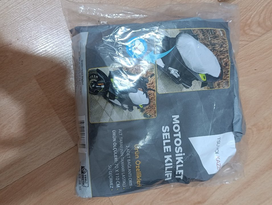 Gri motosiklet sele kılıfı, alt tarafı tamamen lastikli, su geçirmez ve iki adet bağlantı kayışı içerir. Ölçüleri 70x110 cm, Velcro bantlıdır. ️