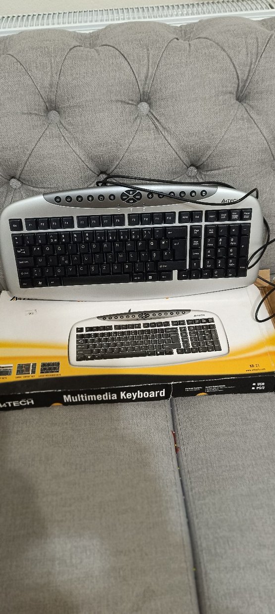 Gri renkli, tam düzenli ve multimedya tuşlarına sahip kablolu USB klavye.