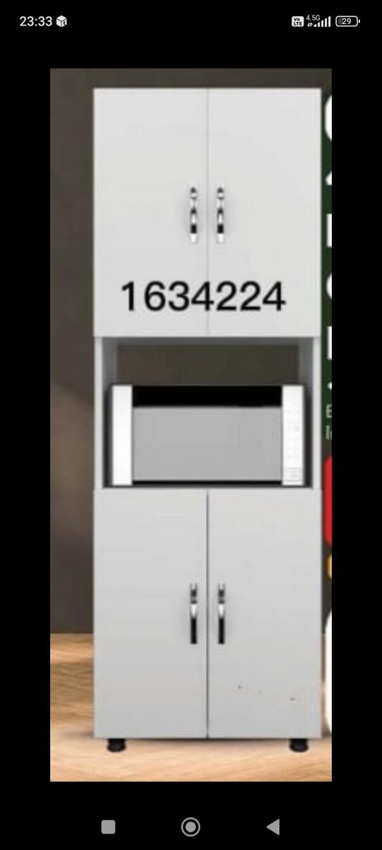 Gri renkte, mikrodalga raflı mutfak dolabı. Üstte ve altta olmak üzere toplam dört kapaklı, kullanışlı saklama alanı sunar. 1634224 numarası mevcuttur.