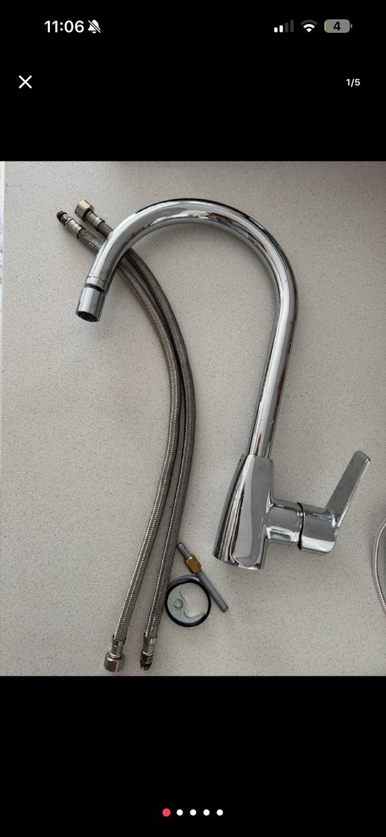 Kavisli çıkışlı ve tek kollu gri mutfak musluğu, esnek hortumlar ve montaj parçaları ile birlikte.