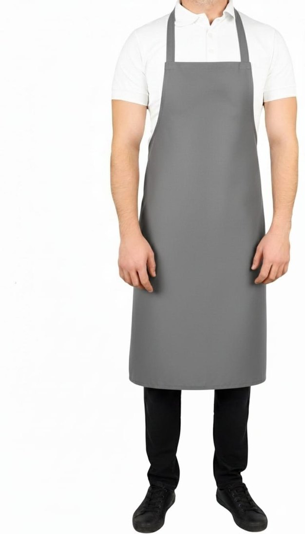 Gri mutfak önlüğü, tam ön kaplama ve desensiz sade tasarıma sahiptir. Ayarlanabilir boyun askıları ve uzun bağcıkları bulunur. Dayanıklı kumaştan üretilmiş, temizlemesi kolaydır.