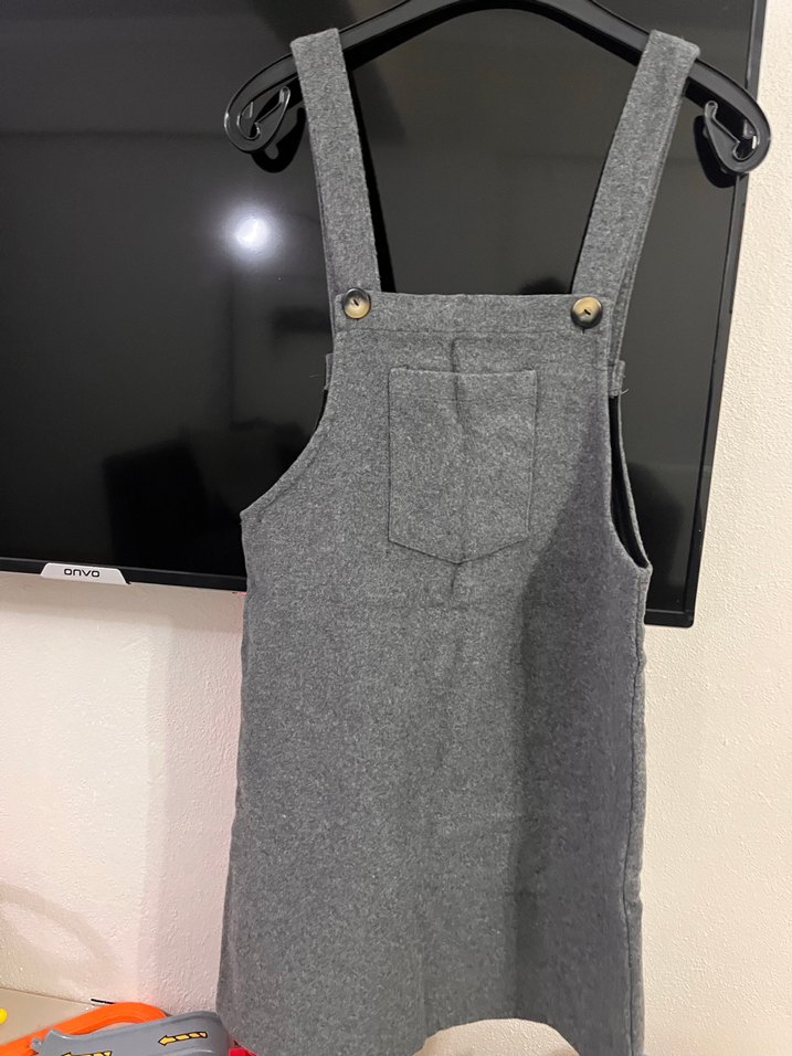Ayarlanabilir askılı, önünde cep bulunan gri mutfak önlüğü, yumuşak ve dayanıklı kumaştan üretilmiştir.