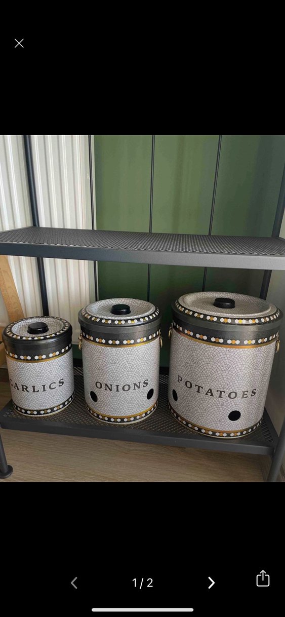 Sarımsak, soğan ve patates için etiketli, dekoratif detaylı gri mutfak saklama kutuları seti.#saklamaseti #metalsoğanlık #metalpatateslik #metalüçlüset #patatessoğansarısaklık #metaldüzenleyici