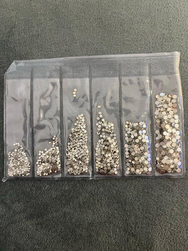Farklı boyutlarda gri tırnak süslemeleri seti, şeffaf bölmeli poşette saklanır. Tırnak tasarımlarına hafif parlaklık katar.