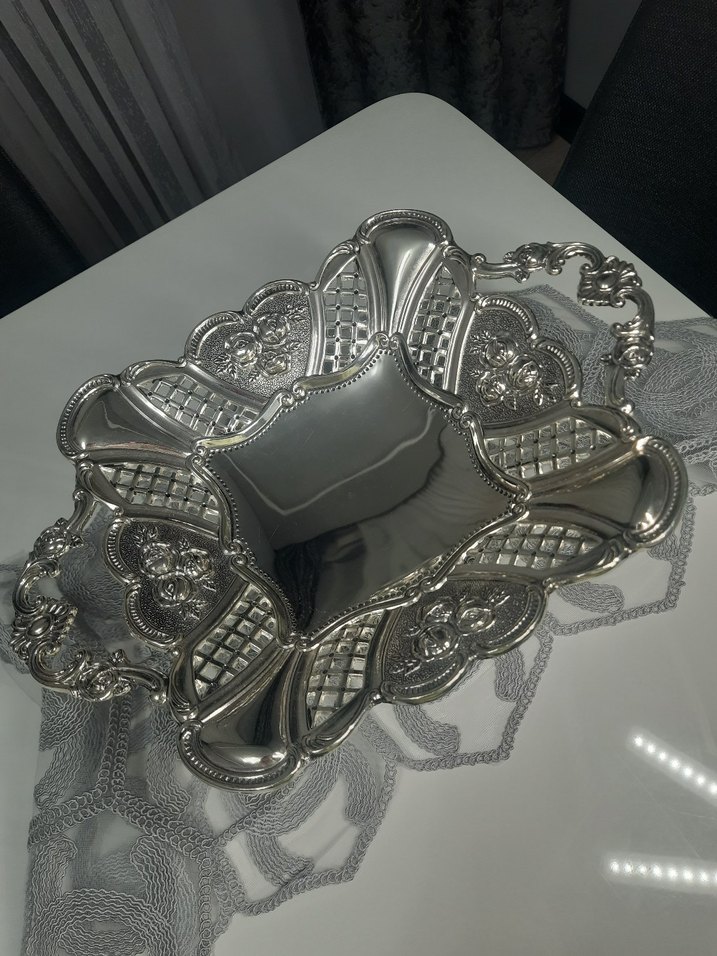 Gri renkte, geleneksel tarzda ve detaylı nakış işlemeli desenlere sahip şık bir tepsi.