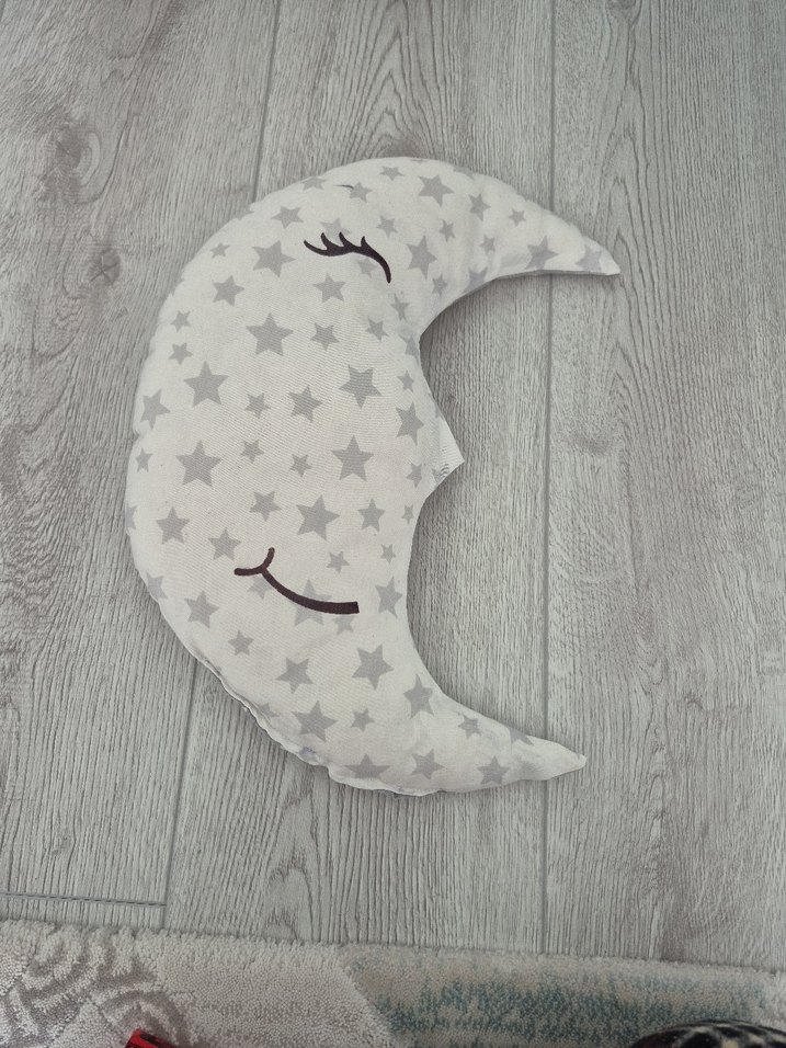 Nakışlı yıldız desenli gri ay şeklinde uyku arkadaşı ve yastığı, konfor ve destek sağlar.