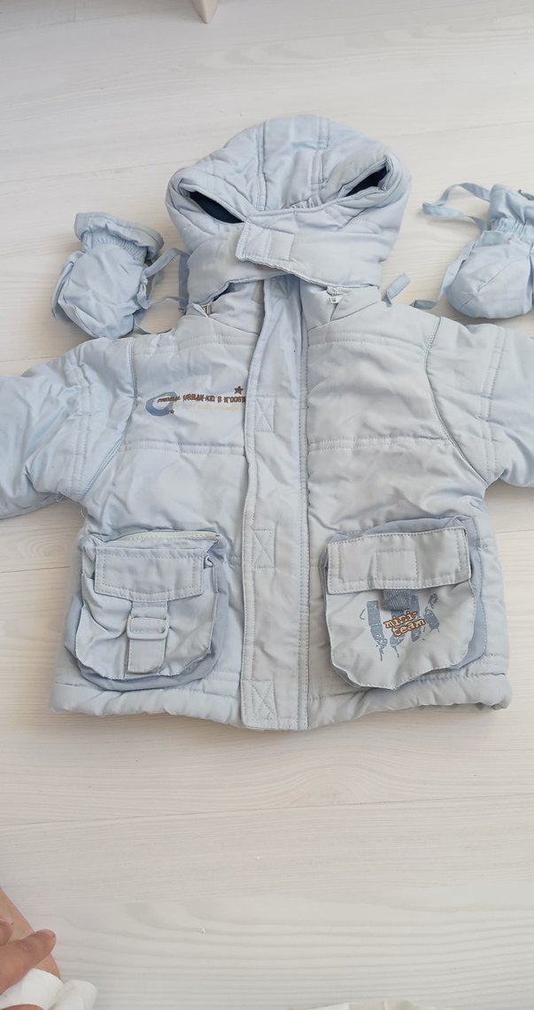 Gri renkte, yumuşak ve sıcak dokulu kumaştan yapılmış, fermuarlı ve nakışlı detaylara sahip bebek erkek montu. Kapüşonlu ve eldivenli.