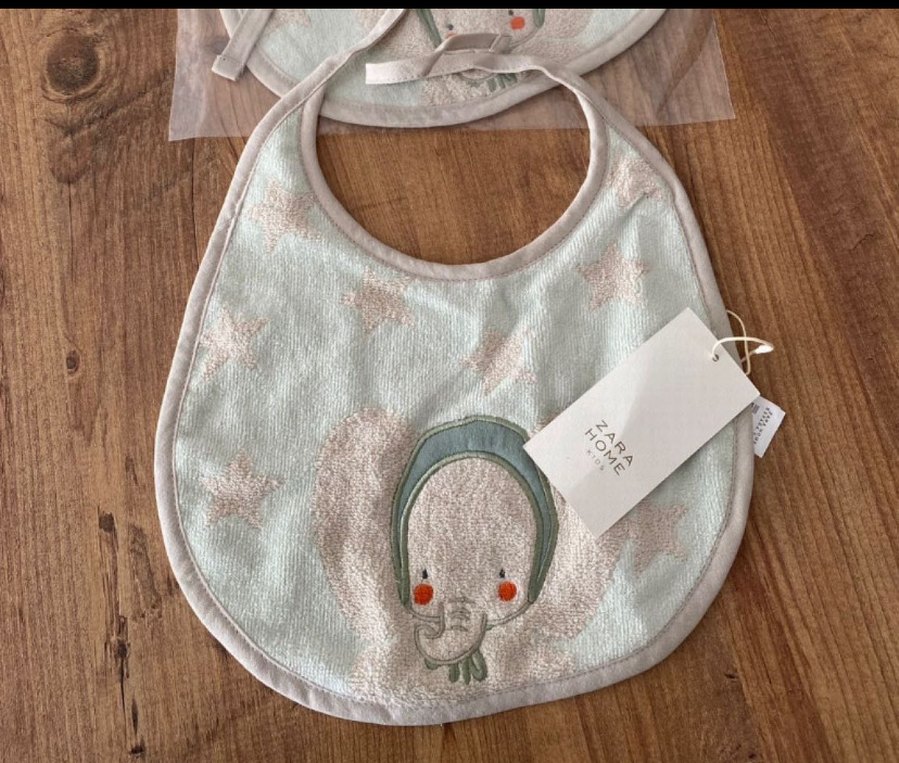 Pastel gri renkte, yumuşak ve emici kumaştan yapılmış, nakışlı yıldızlar ve sevimli fil desenine sahip bebek önlüğü.