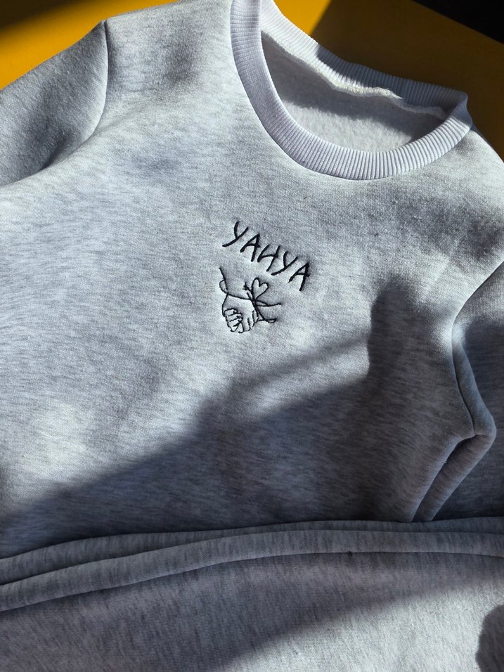 Pamuklu, uzun kollu, yuvarlak yakalı gri kadın sweatshirt. Rahat kesimi ve nakışlı 'YAHYA' yazısı ile günlük sokak stili için uygun.İsimli 3 iplik şardonlu puff kumaştan dikilmiş alt-üst takım Sıcacık, yumuşacık ve rahat dokusuyla kış aylarında minikler hem şık hem konforlu ✨ fiyatlar 0-5 yaş grubu için gecerlidir