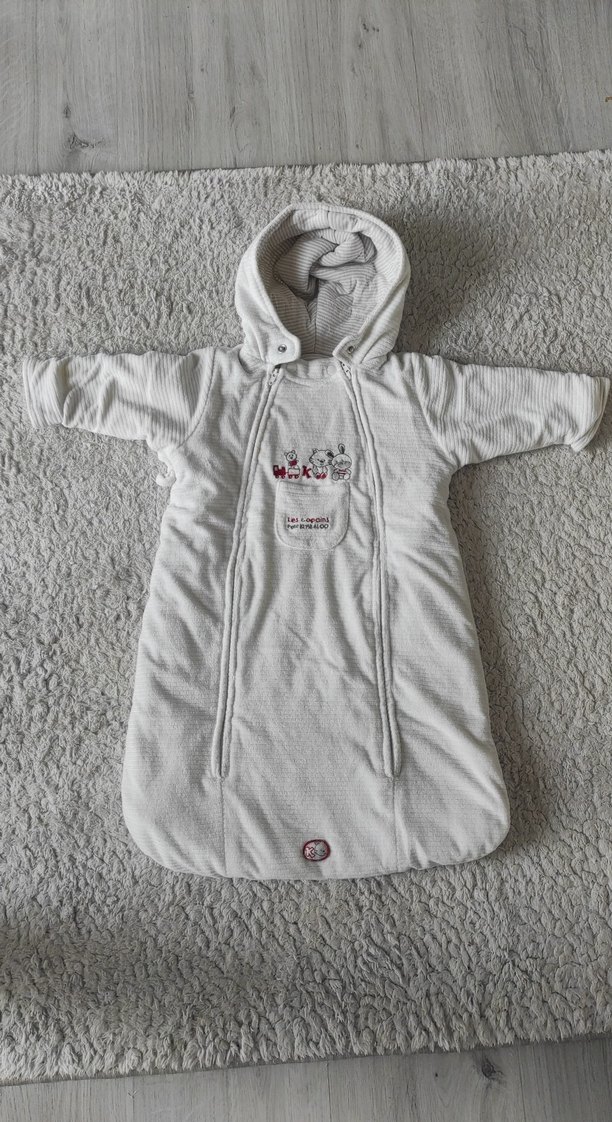 Gri nakış detaylı beyaz bebek tulum, kapüşonlu ve fermuarlı, yuvarlak yaka ile rahat kullanım sağlar. ❄️ göründüğü gibidir