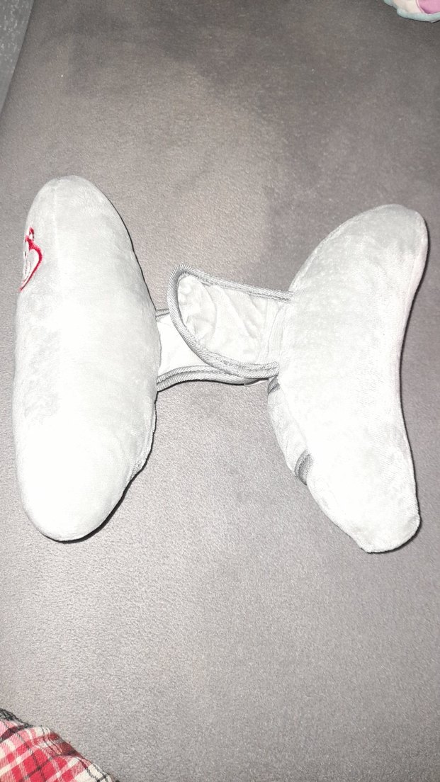 Yumuşak kumaştan yapılmış, gri nakış detaylı beyaz çocuk yastığı, konforlu destek sağlar. ️boyun koruyucu her arabaya uygundur