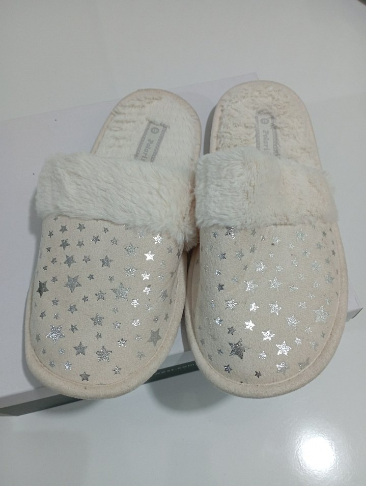 Yumuşak kürk detaylı, düz tabanlı beyaz kadın ev terliği, gri nakışlı yıldız desenleriyle rahat bir kullanım sunar.