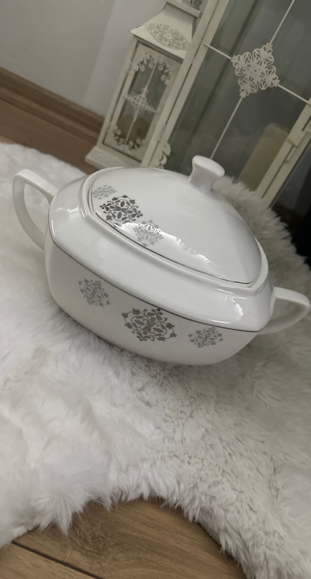 Beyaz porselen güveç, kapaklı ve gri nakışlı desenlerle klasik tasarım sunar, pratik kulpludur.