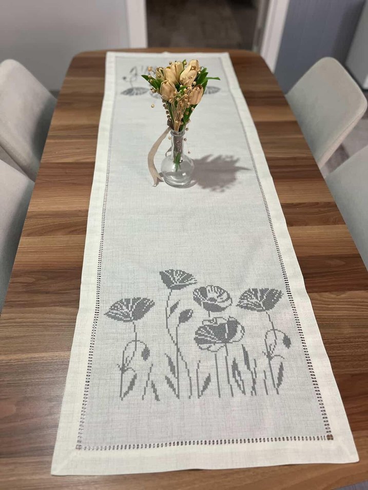 Gri nakışlı çiçek desenine ve ince kenar detaylarına sahip beyaz masa örtüsü, masanıza klasik bir dokunuş katar. #runner #masaörtüsü #kaneviçe #çeyiz