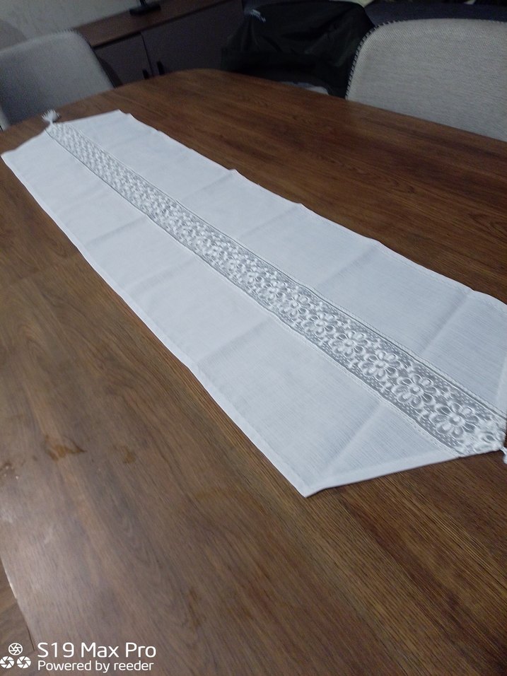 Orta kısmında gri nakış deseni bulunan beyaz masa örtüsü, klasik ve şık bir görünüm sunar. ✨