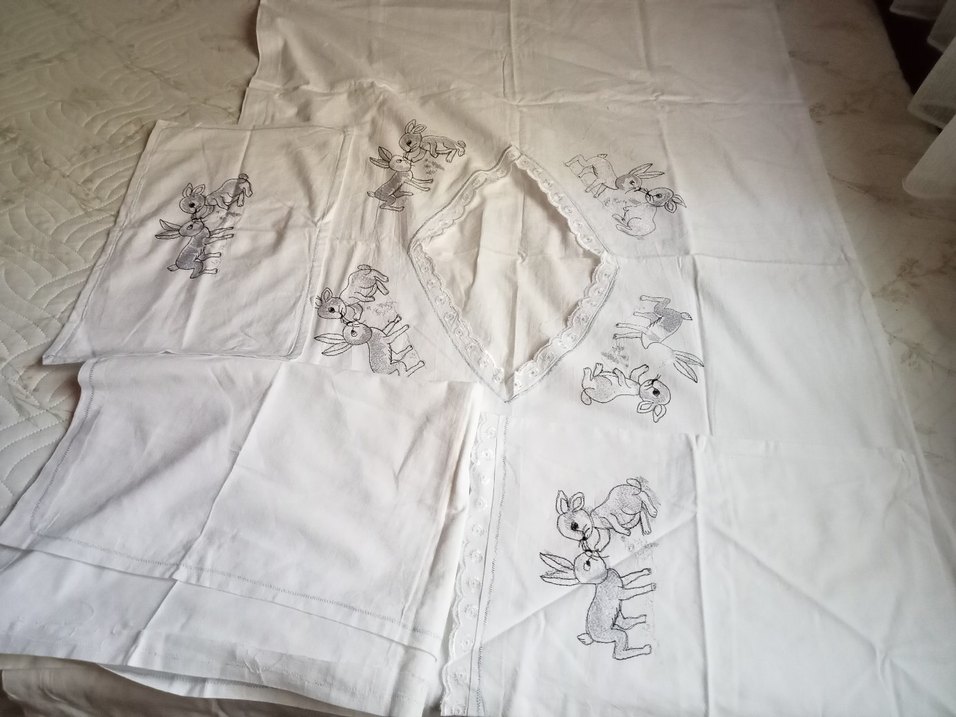 Gri nakışlı tavşan desenleri ve zarif dantel detaylarıyla beyaz nevresim takımı. Yumuşak ve şık yatak takımı ️. Bebek beşik nevresim takımı