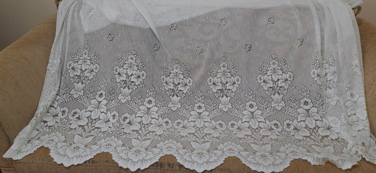 Beyaz nakışlı çiçek desenlerine sahip, klasik tarzda beyaz perde. İnce detaylarla süslenmiştir. kullanılmıştır fakat yıkanmıştır hiçbir defosu yoktur tertemizdir.Eni 2,10 boyu 2 metre.