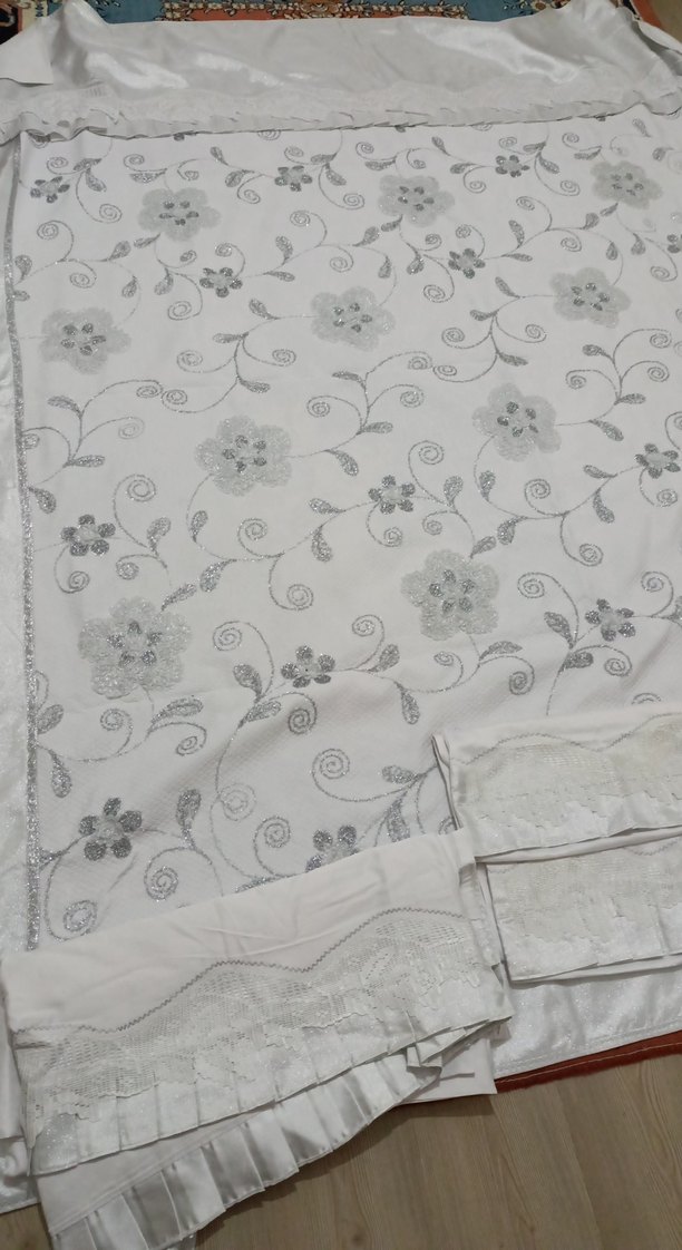 Gri çiçek nakışlarıyla süslenmiş beyaz pike ve çarşaf takımı, şık bir görünüm sunar.Yastıklarında sandık sarartısı var pike sorunsuz.1 Pike 2 yastık 1 çarşaf danteliyle birlikte .