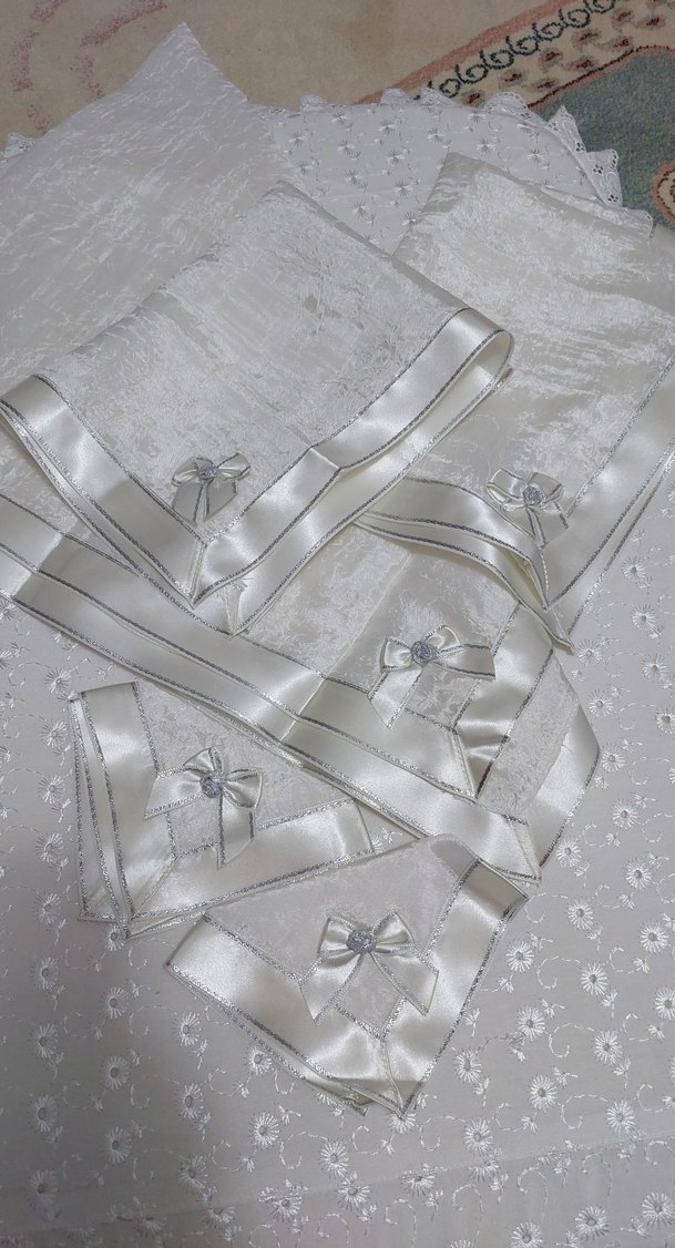 Gri nakışlı detaylar ve saten kurdele süslemeleri olan beyaz renkte 18 parça salon takımı. Geleneksel masa düzenlerine uygun, zarif fiyonklar içerir. ️