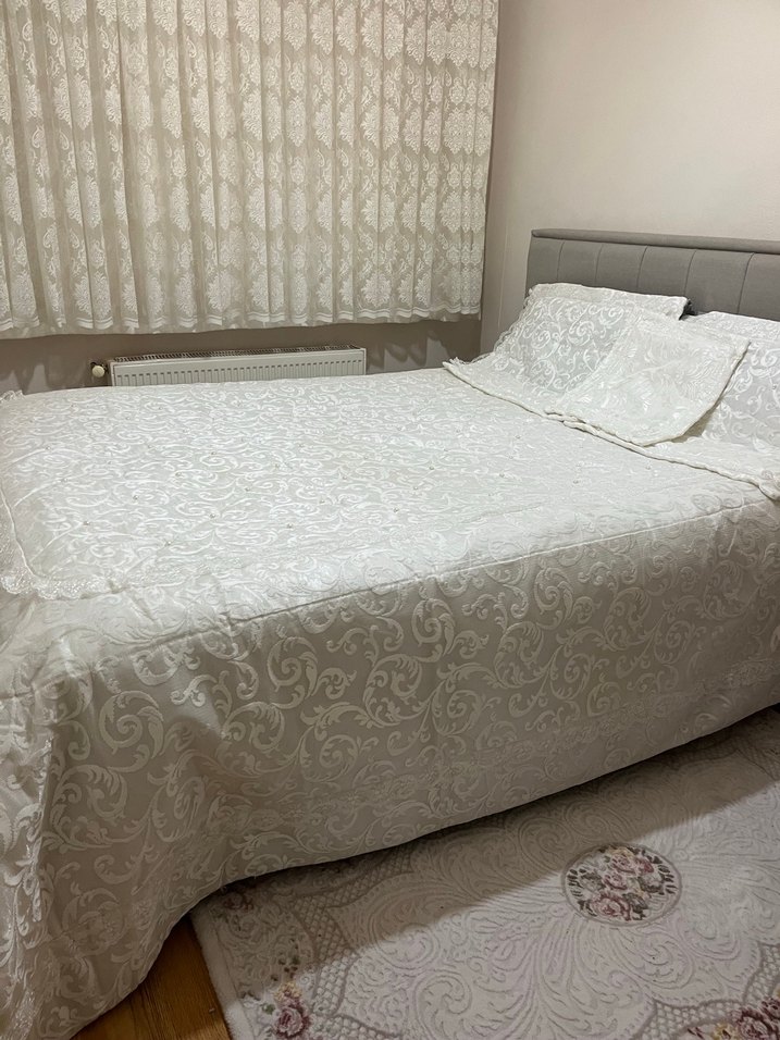 Beyaz nakış desenleriyle süslenmiş beyaz yatak örtüsü, yatak odasına zarif bir dokunuş katıyor. Uyumu sağlayan yastık kılıflarıyla birlikte.
