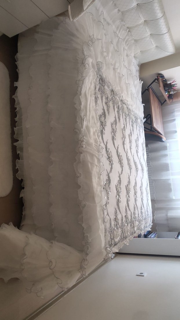 Gri nakışlı desenlere ve fırfırlı kenarlara sahip beyaz yatak örtüsü, odaya zarif bir dokunuş katıyor ️.markasızdır