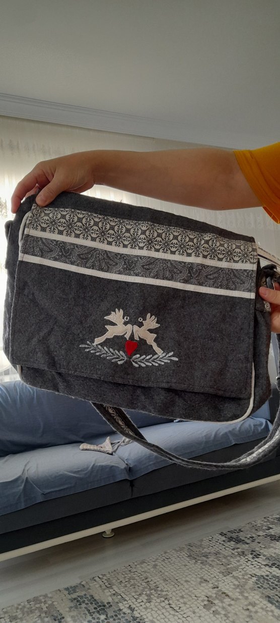 Nakışlı desenlere ve kapak detayına sahip gri tekstil kadın çantası, rahat bohem tarzını yansıtıyor. Günlük kullanıma uygun.