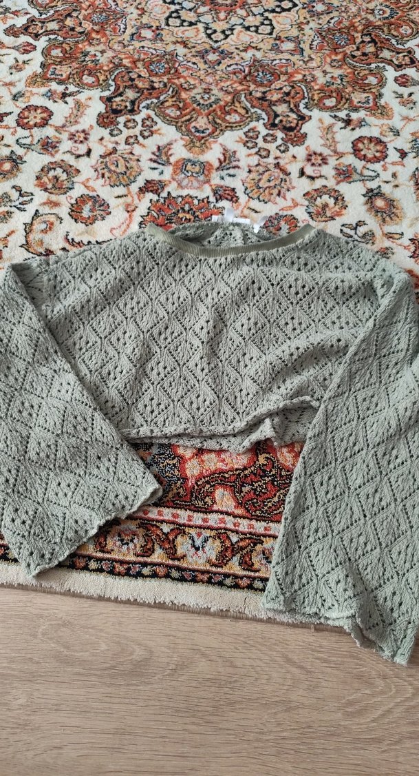 Gri renkli, uzun kollu, kayık yaka ve bol kesim nakışlı triko kazak, günlük kullanıma uygun rahat bohem tarz sunar.