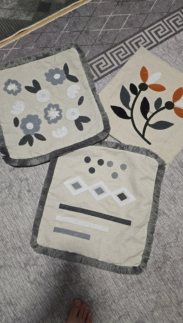 Üçlü gri tonlarda, nakışlı çiçek ve geometrik desenlere sahip, püsküllü kenarlı bohem tarzda kılent kılıfı seti. ️