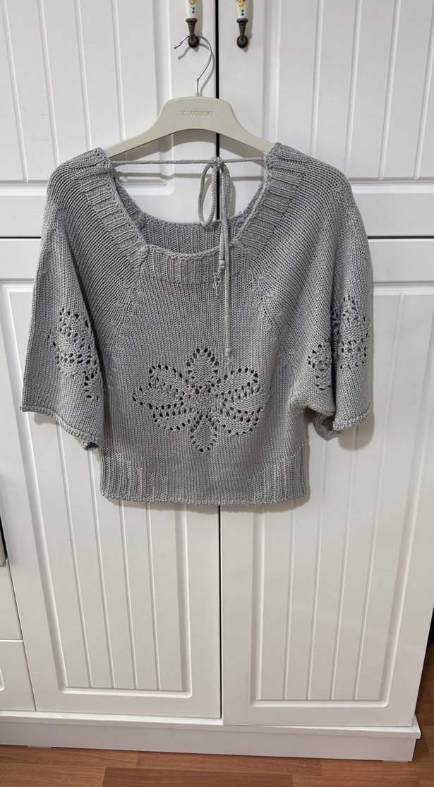 Gri renkte, nakışlı kısa triko kadın kazak. Salaş kesim, kısa boy, yuvarlak yaka ve kısa kolludur. Bohem tarzıyla günlük kullanıma uygundur. marka temsili
