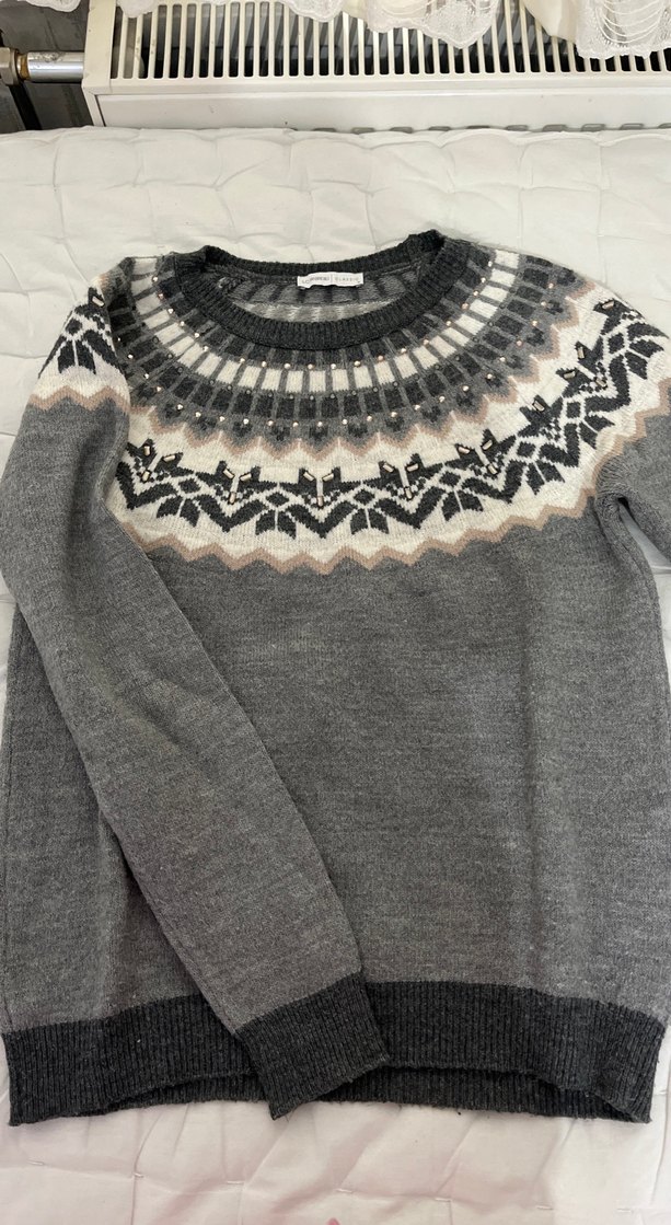 Gri renkli, yuvarlak yaka ve uzun kollu, nakışlı bohem desenlere sahip örgü kadın kazak, rahat ve bol kesimdir.