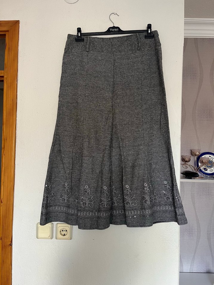 Gri renkte, bol kesim, pileli ve etek ucu nakışlı bohem uzun etek. Yumuşak keten kumaştan, günlük kullanım için uygun.