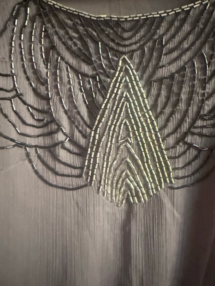 Gri renkli, nakışlı ve boncuk işlemeli kadın elbise dış mekan ve avangart tarzlar için uygundur. M bedendir