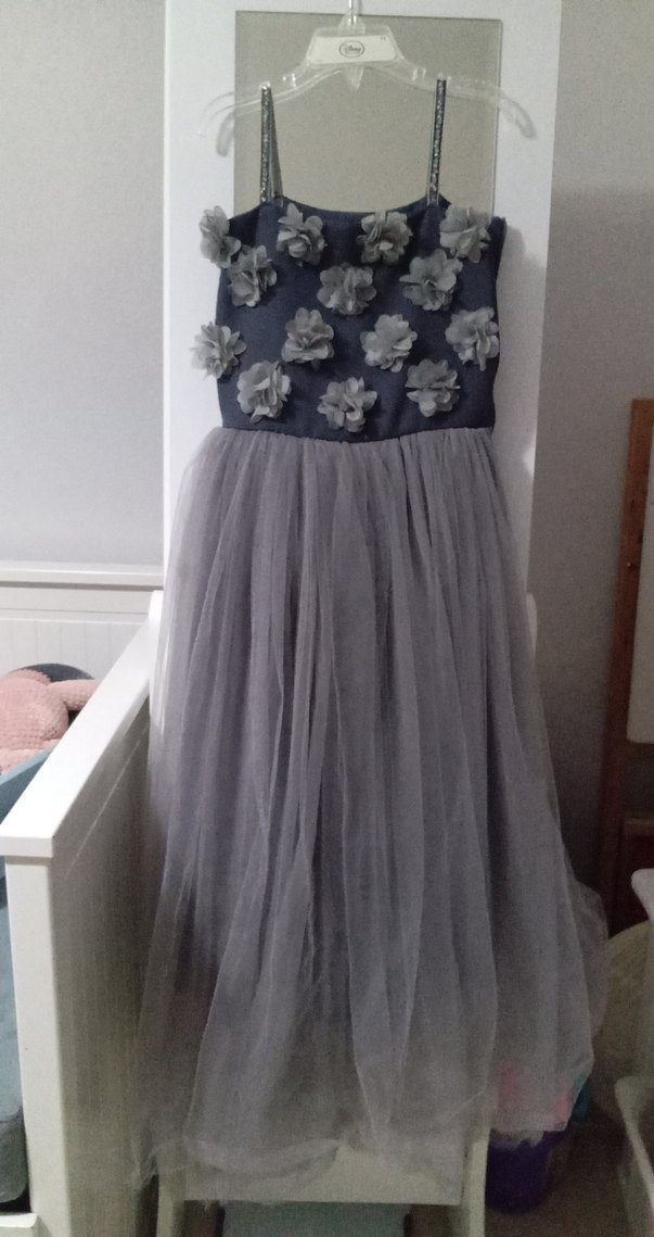 Nakış işlemeli çiçeklerle süslü, ve yumuşak sentetik kumaştan yapılmış gri kız çocuk elbisesi.