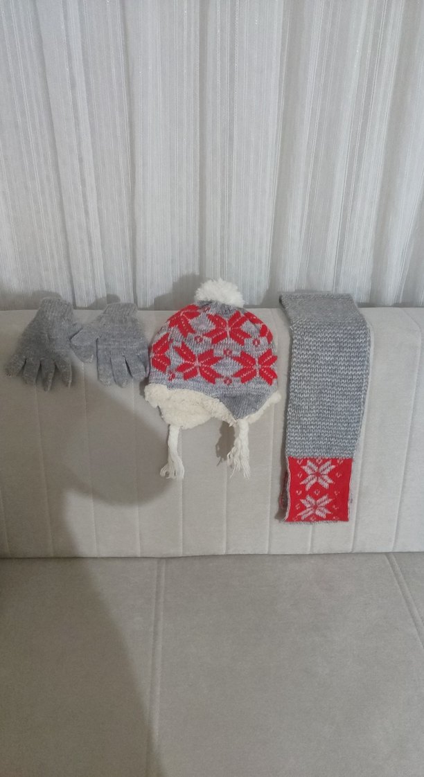 Çocuklar için nakışlı kırmızı desenli gri örgü bere, kulaklıklı ve ponponlu, yanında uyumlu atkı ve eldiven seti. Retro tarzda ve sıcak tutar.
