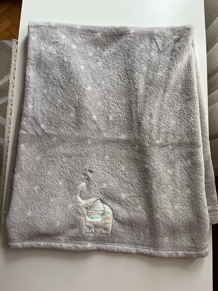 Yumuşak ve sıcak gri çocuk battaniyesi, nakışlı fil detayı ile. Rahat kumaşı çocukların konforu için uygundur. 70x95 cm
