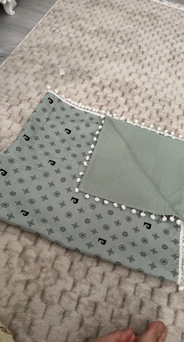 Gri renkte, nakışlı desenlere ve ponponlu kenarlara sahip yumuşak dokulu çocuk battaniyesi. Rahatlık ve şıklık sunar.