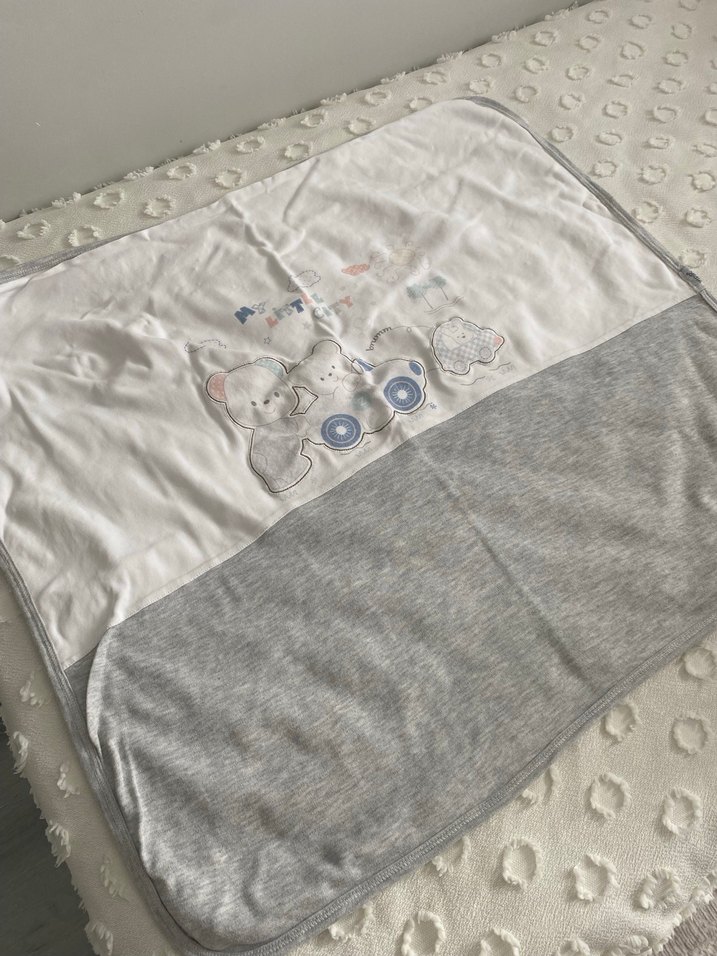 Yumuşak ve sıcak gri kumaştan yapılmış, üzerinde oyuncu ayı nakışları bulunan çocuk battaniyesi. Çocuklar için rahat ve konforlu bir seçim.
