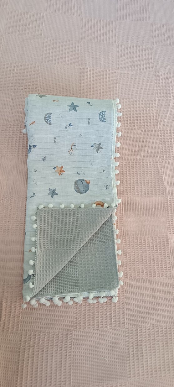 Gri renkli, nakışlı desenlere sahip çocuk battaniyesi, yumuşak sentetik kumaş ve ponponlu kenarlarla rahatlık sunar.