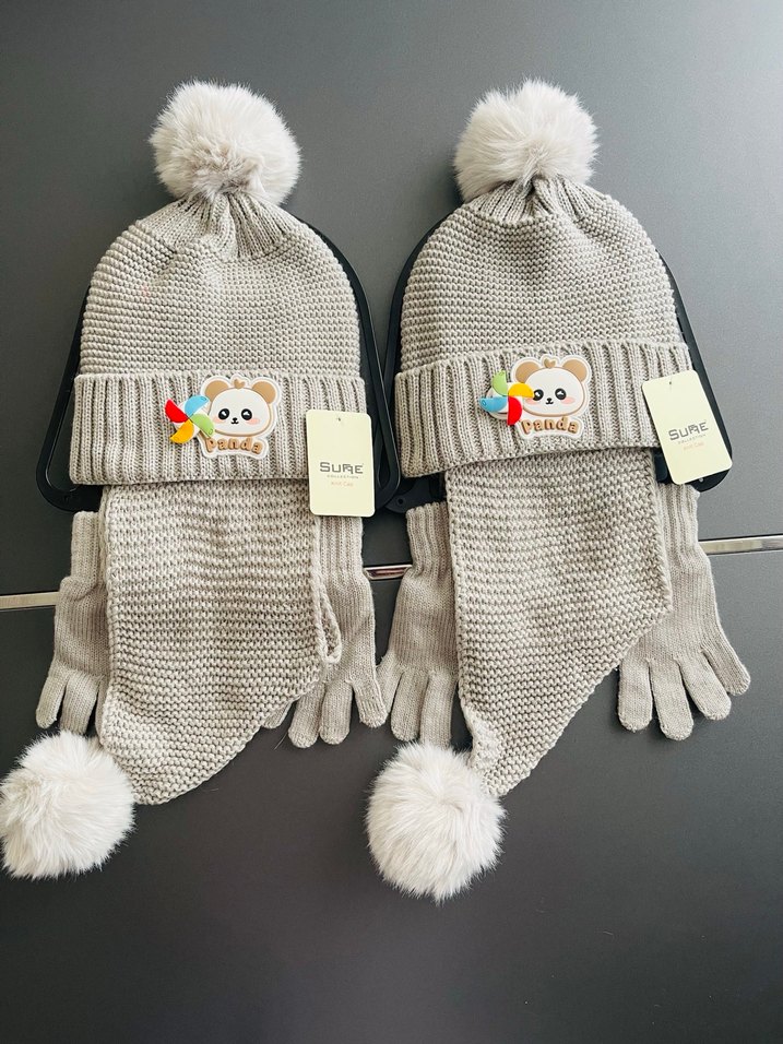 Gri renkli, nakışlı detaylı bere, ponponlu atkı ve eldivenlerden oluşan örme set, trend sokak stili için uygundur.