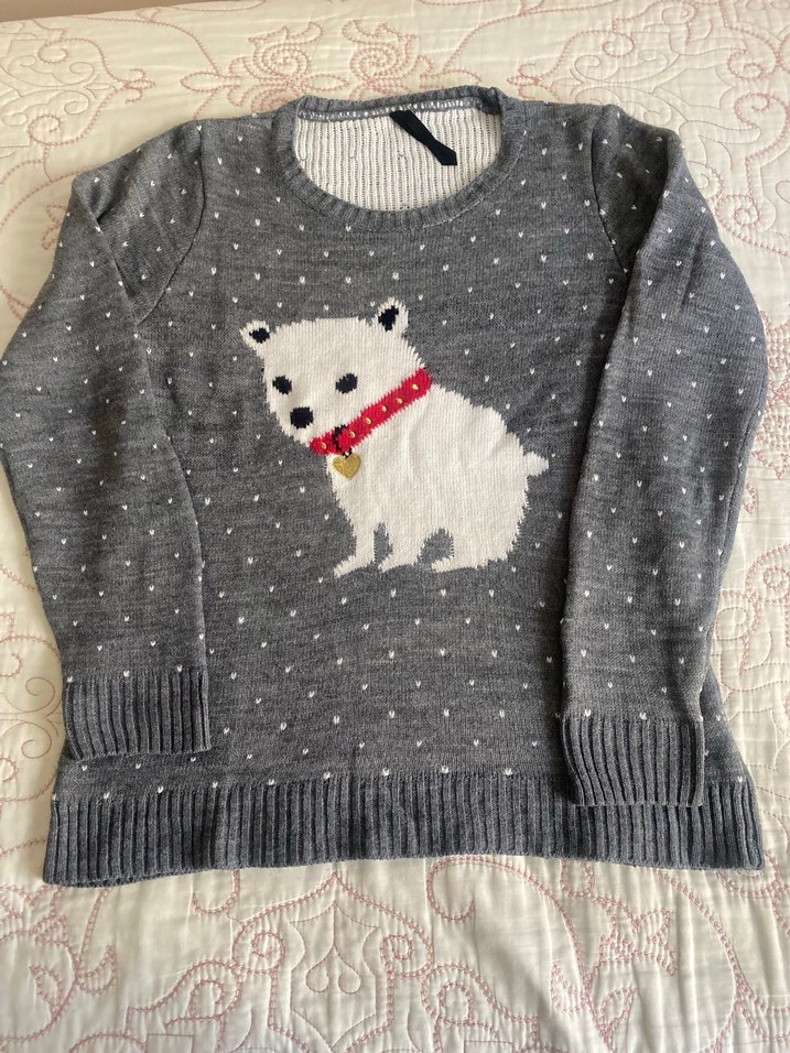 Gri renkli, ince triko kumaştan yapılmış, yuvarlak yakalı ve uzun kollu, beyaz köpek nakışlı, rahat kesim çocuk kazak.