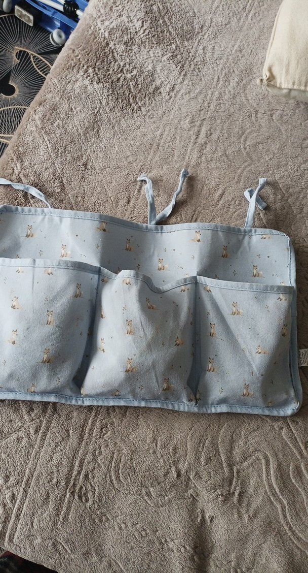 Gri renkte, nakışlı detaylara sahip çocuk yatak yanı organizeri. Yumuşak ve sıcak kumaştan, çoklu cepleriyle eşyalar için pratik kullanım sağlar. ️