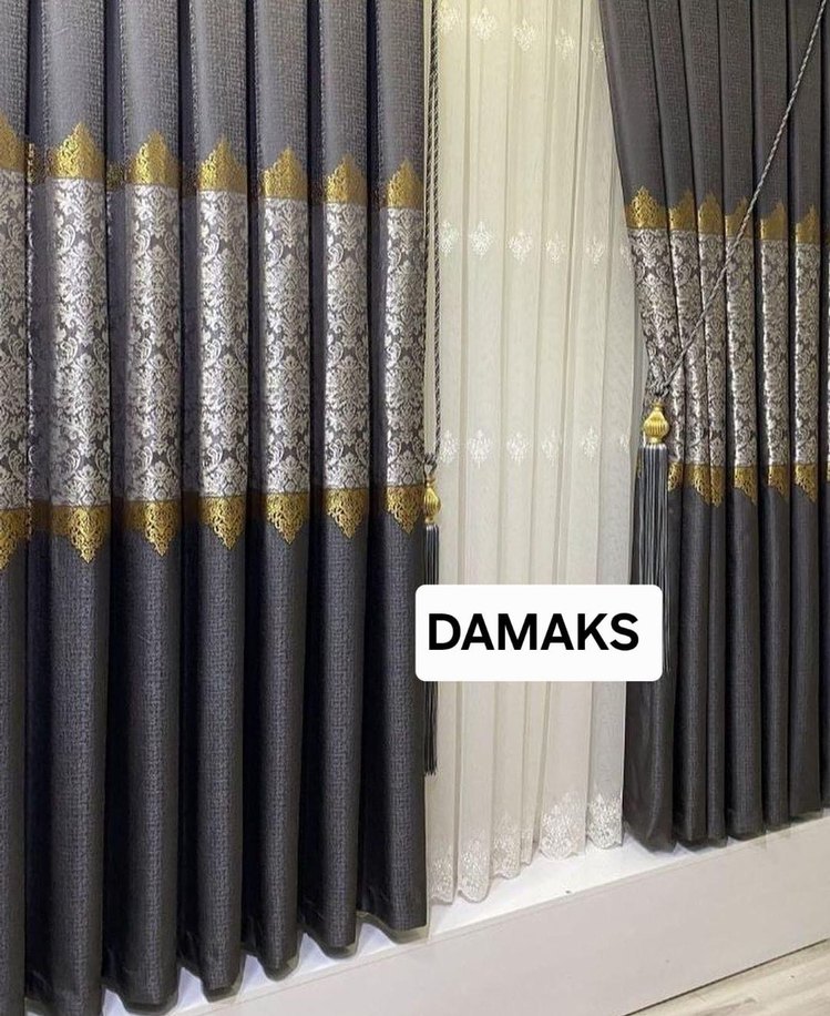 Nakış desenli gri klasik perdeler ve beyaz tül katman içerir. Süsleyici püsküllerle tamamlanmıştır. Marka Damaks.