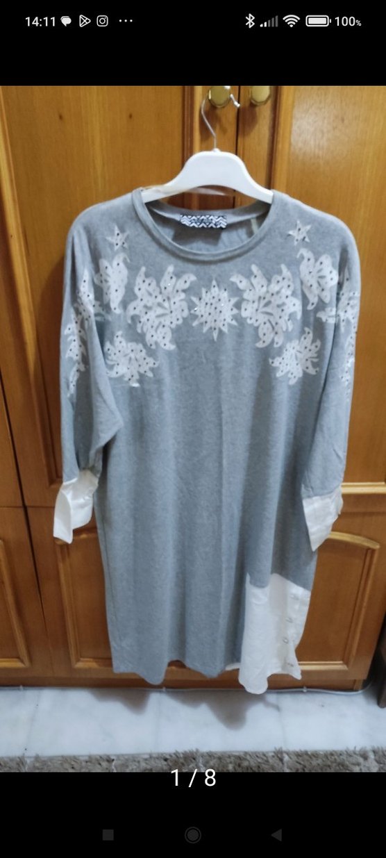 Gri renkte, V yaka, uzun kollu, nakışlı ve dantel detaylı tunik. Bol kesim ve midi boyda, bohem tarzı için uygun.