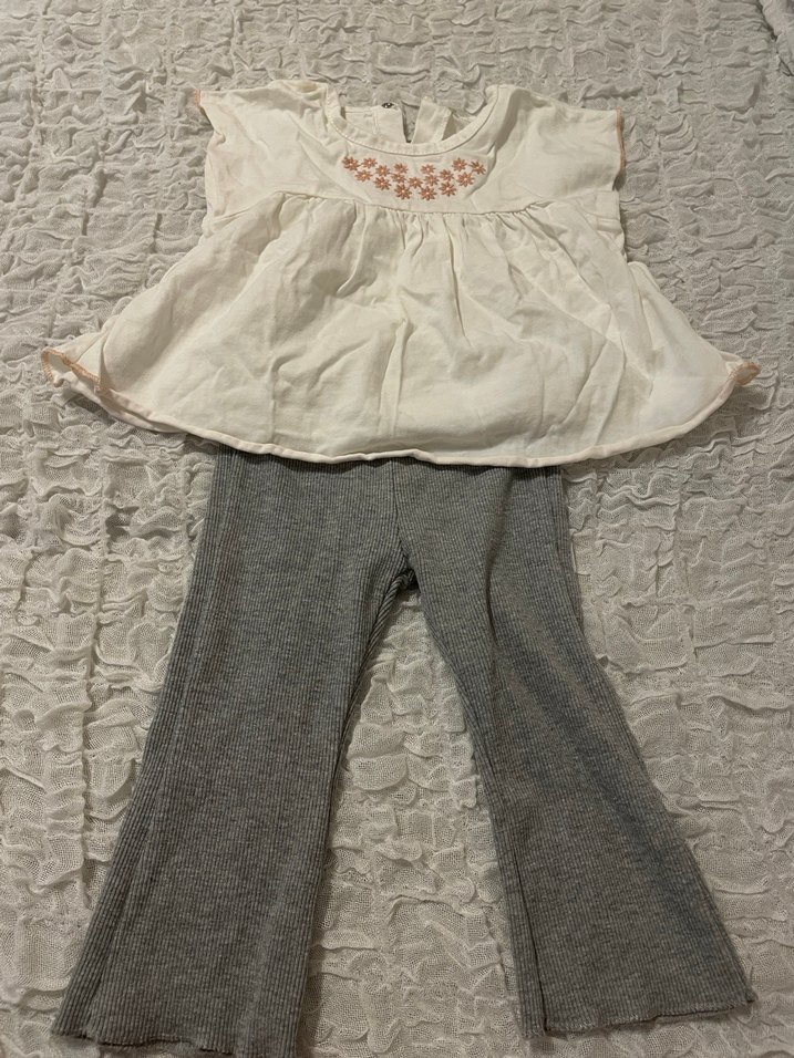Dantelli nakış detaylı kolsuz üst ve gri fitilli pantolonlu kız bebek takımı. Rahat ve şık.