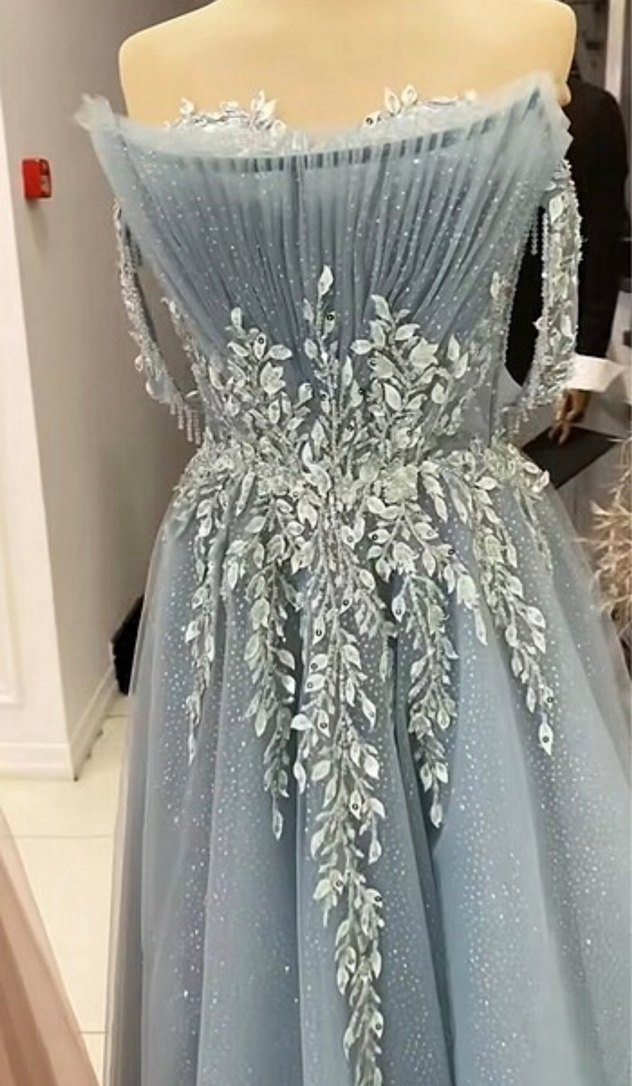 Gri Nakışlı Drapeli Uzun Abiye Elbise