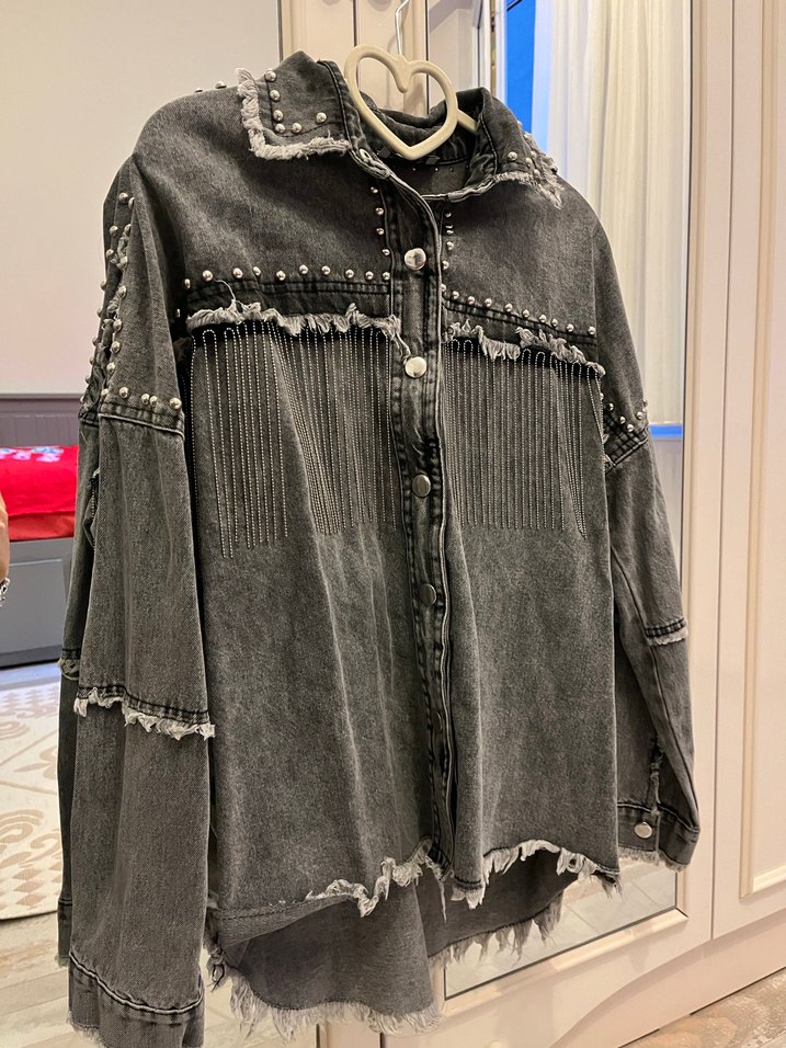 Gri renkli, düğmeli ve nakışlı kadın denim ceketi. Uzun kollu, notched lapelli, bol kesim ve midi boyda, günlük kullanıma uygun. İster ceket ister gömlek olarak kullanabilirsiniz